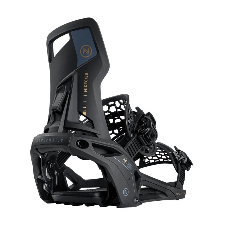 The Nidecker Supermatic is a game changer – the world’s first automatic binding that works with any boot. Just push your foot in through the back and step down on the heel pedal to flip up the hiback. That’s it – you’re ready to shred. A simple release lever makes exiting just as rapid. Supermatic feels just like a classic two-strap binding to ride, and you can even operate the ratchets normally if the conditions demand it. Steep slope? Deep pow? No problem.